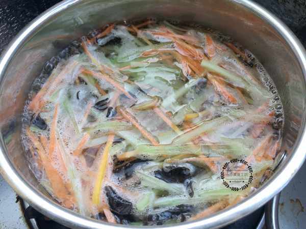 1、將雞蛋打散放入油鍋中攤成蛋餅,然後切絲備用。木耳提前泡發後清洗幹凈,切絲備用。胡蘿卜和萵筍去皮洗凈後切絲,放入熱水中焯燙變軟後晾涼備用。