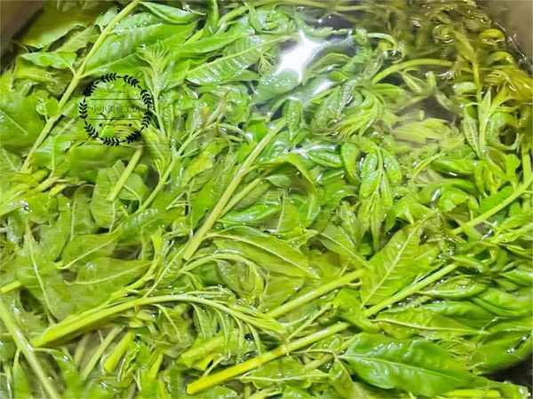 1、將香椿清洗幹凈後,放入鍋中焯燙變色且變軟後過涼水備用。