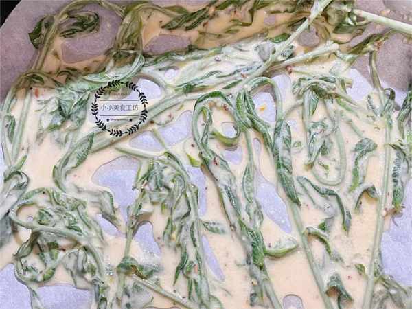 3、將焯燙好的香椿放入面糊中裹勻,然後放入空氣炸鍋中,200度炸制5分鐘後翻面繼續炸制,時間到後即可取出食用。