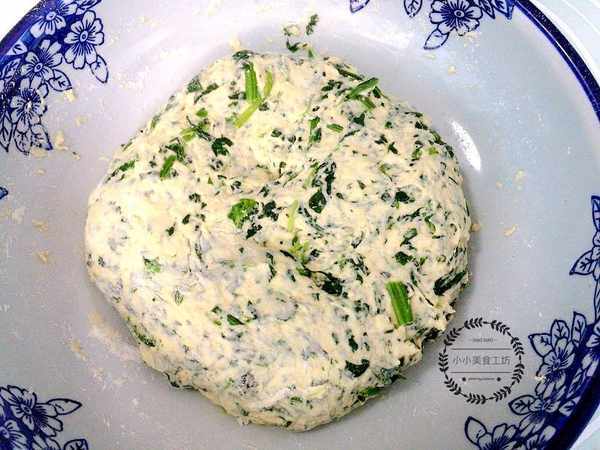 2、接著在菠菜碎中加入適量食鹽拌勻,再少量多次加入玉米粉和面粉揉成光滑的菜團。