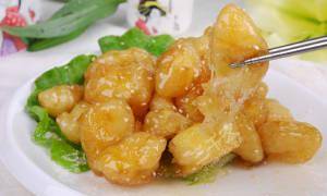 7.然後倒入炸好的蘋果,邊攪拌邊炒至順滑。