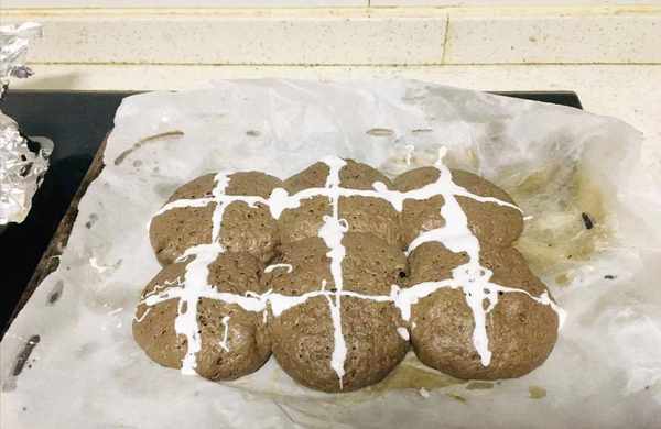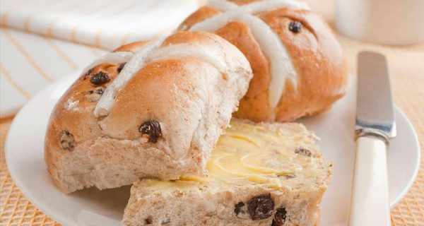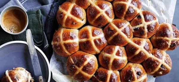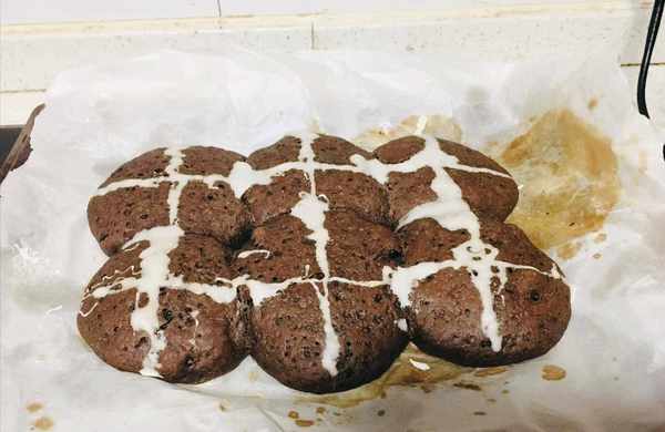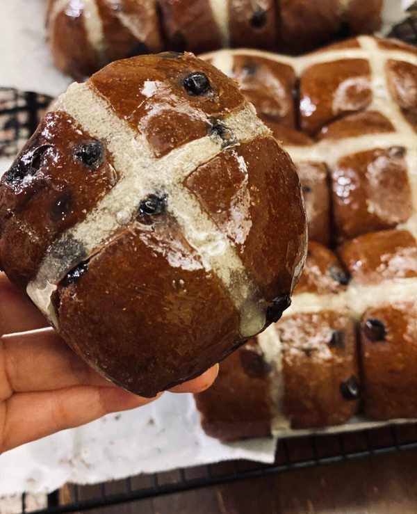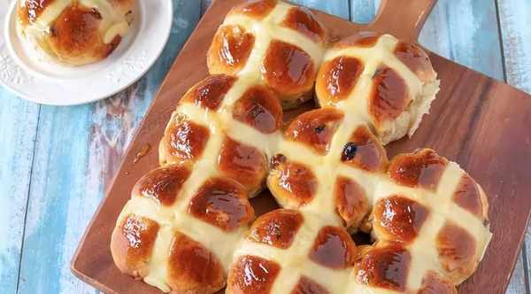 Hot cross bun熱十字面包,顧名思義,就是面包上面有個十字圖案,通過高溫烘烤而成,最後還要在表面抹上滾燙的蜂蜜糖漿。它的口味豐富,可以做成原味的,如下圖這種,類似於加瞭幹果/水果幹的