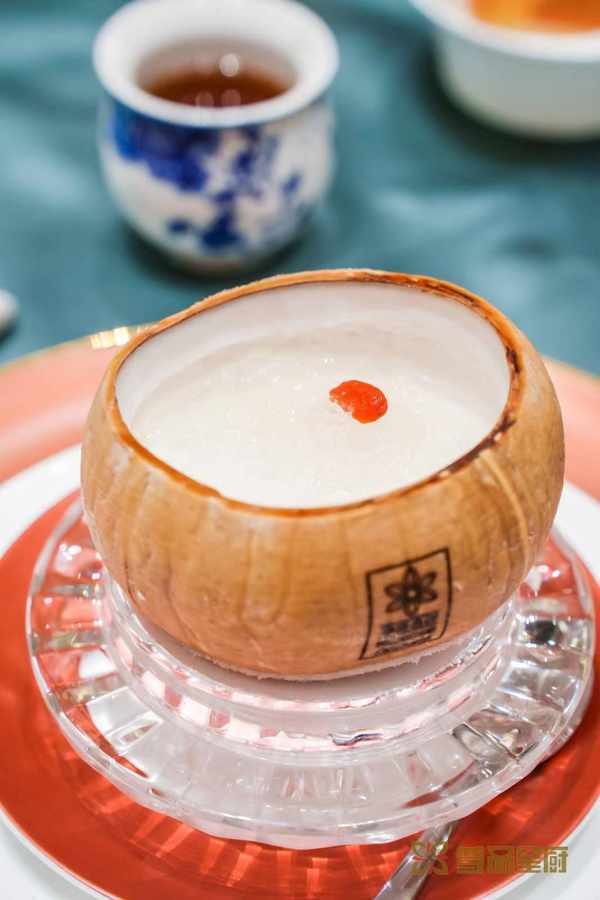 由利永周大師主理的這道甜品,以名聞遐邇的海南特產鮮椰皇,搭配燕窩中的上品——官燕細火慢燉,濃鬱的椰香和燕窩的細膩完美融合,清甜潤滑,滋陰養顏,令人回味。