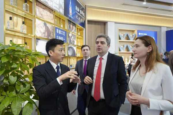 座談會結束後,4月11日上午,阿爾赤·卡嵐迪亞大使,別斯克·沙拉申尼澤參贊,中國食品發酵工業研究院研發總監、國際評委黃宇彤一行,在寶豐酒業有限公司董事長王若飛的陪同下,參觀瞭位於成都大成賓館的名酒寶豐酒店展,寶豐酒業有限公司副總經理兼首席品牌官許英傑陪同參觀。