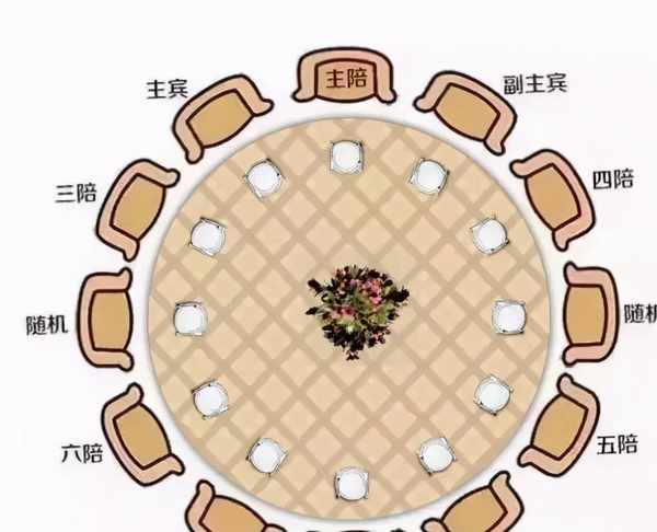 一般而言,圓桌面向大門之位為主人座,主客坐在主人右手座,主人客人依次間隔就座;也有些地方圓桌面向大門之位為上座,為主客的座位,主人坐在主客的左手位置。需要註意的是,主人的正對面,也就是背對進門的位置,是副陪坐,副陪是請客方第二位較尊貴者,任務艱巨,需要配合主人招呼客人,並以身作則帶動客人喝酒,加深主客之間的感情。