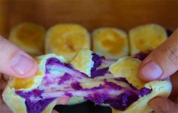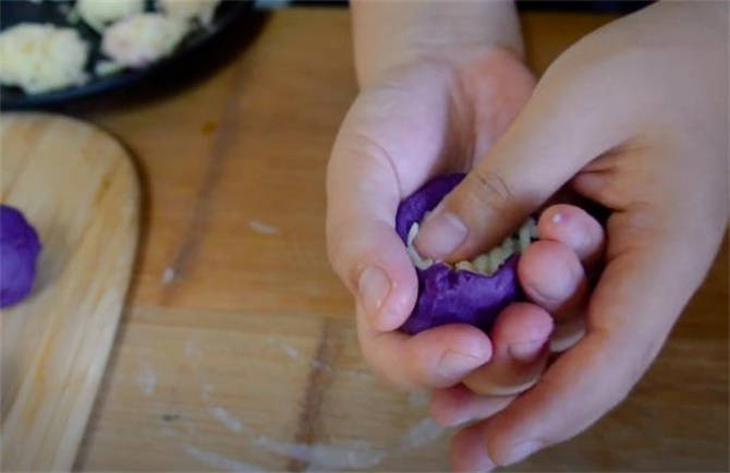 7.切完面劑之後咱們先取一個紫薯餡按扁,裡面包上芝士,把這個收口給收緊瞭。