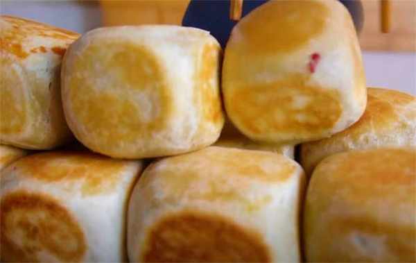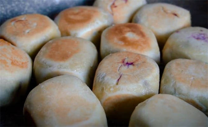 9.不粘鍋小火預熱好刷油,可以多刷一點油,這樣烙的顏色也好看,吃著也好吃,烙瞭大概有一分鐘,咱們多翻幾次面,每一個面都爭取給它烙到熟瞭,來回的多翻動幾次,烙到六個面都黃洋洋的,咱們就可以出鍋瞭。