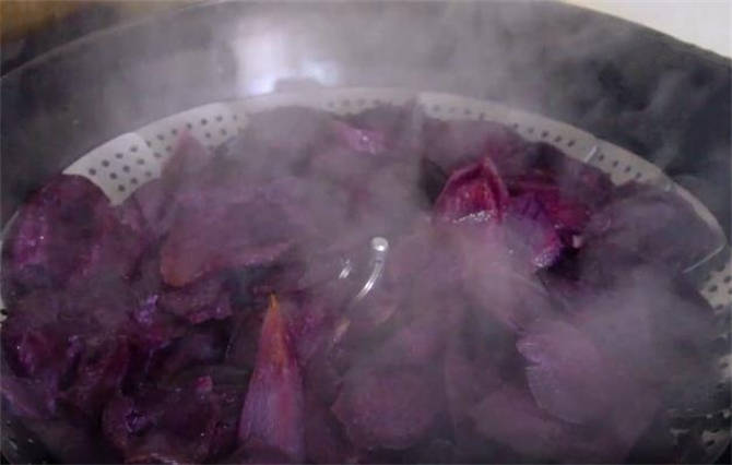 2.昨天剛在超市買瞭紫薯,咱們用它來做餡,紫薯都切好瞭,簡單的上鍋蒸一下,水開之後蒸15分鐘,時間到瞭關火。