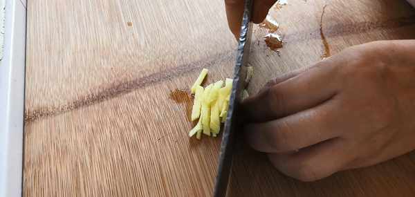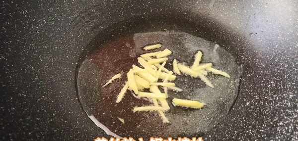 3. 起鍋加熱,倒入食用油,放入薑絲,之後再放入河蝦翻炒。