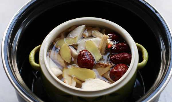 5.燉湯比較省事,不用看爐火,所以我把汆燙好的鷓鴣肉、紅棗、淮山等全部放入燉盅內,隔水蒸燉50分鐘。