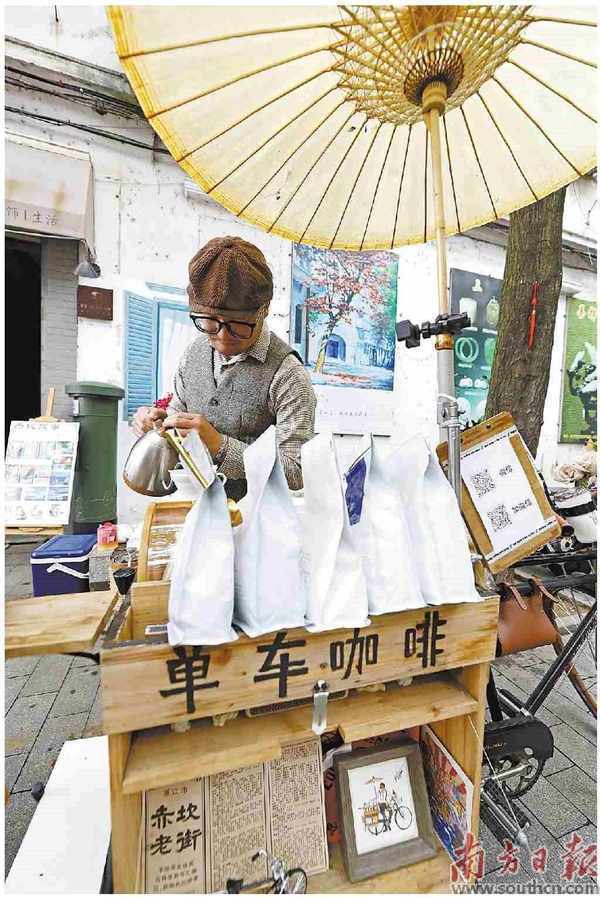 老街的包容性在單車咖啡的經營者阿龍身上體現得淋漓盡致,他曾經營著一傢咖啡店,由於種種原因咖啡店倒閉瞭,手頭創業資金緊缺的他用一部“二八大杠”復古自行車開啟瞭二次創業。作為手沖咖啡的堅守者,阿龍依靠品質吸引瞭一批熟客,也有老外慕名前來,在巴斯夫湛江一體化基地工作的博安格就是阿龍的常客。而今,阿龍的單車咖啡館已成為赤坎街頭一道獨特的風景,不少遊客慕名前往合影。