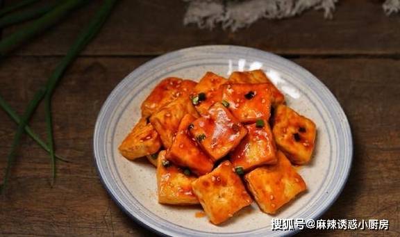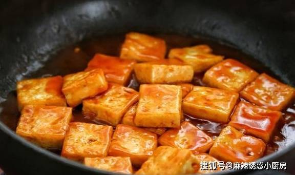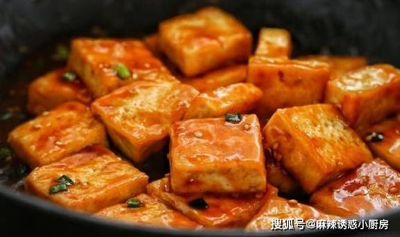 4、不用另加油,用鍋裡油就夠瞭,倒入調好的糖醋醬汁,用小火炒至黏稠,醬汁冒泡後就可以倒入煎好的豆腐塊瞭,快速的翻炒均勻讓豆腐塊都裹上醬汁就可以瞭