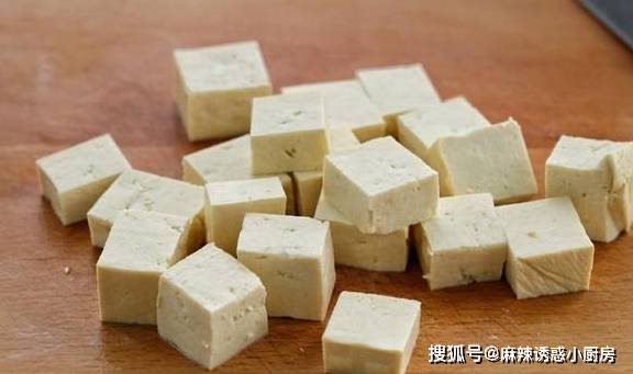 1、買豆腐一定要買老豆腐,結實點的,這樣在後面烹飪的時候不會碎。將買來的豆腐用清水沖洗一下,用刀將其切成厚片,然後再切成自己需要的大小的方塊狀;
