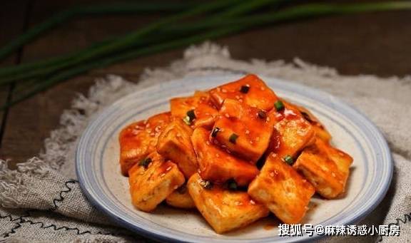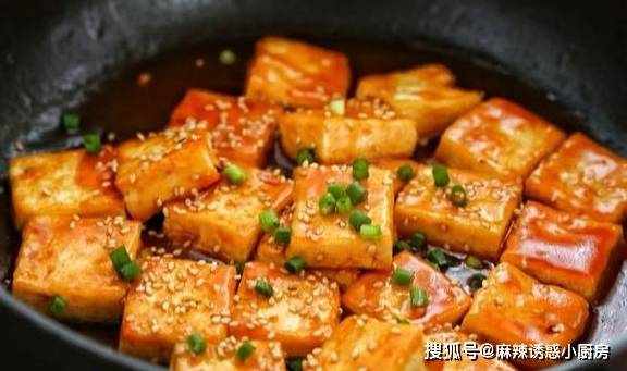 5、等豆腐完全吸飽醬汁就可以關火瞭,不要把湯汁都收幹,稍留一些。然後在豆腐上撒上切好的小蔥花和適量的白芝麻,翻炒幾下就可以轉盤