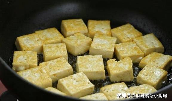 3、取一幹凈的炒鍋,鍋裡加入適量的食用油,油燒熱五成熱後就依次放入切好的豆腐塊,用小火慢慢煎豆腐塊,等一面煎至定型後就可以翻面瞭,期間要經常翻面,以免豆腐煎糊瞭,等兩面都煎成焦黃色就可以盛出,放置一邊備用瞭
