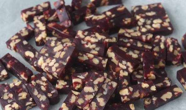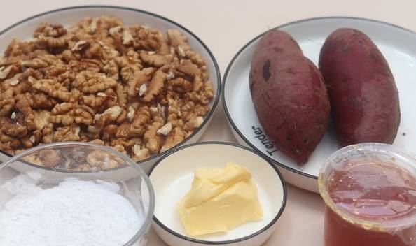 熟紫薯300克、核桃220克、麥芽糖260克、黃油40克、木薯粉40克、水300—350克適量