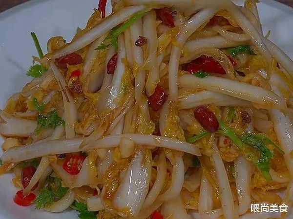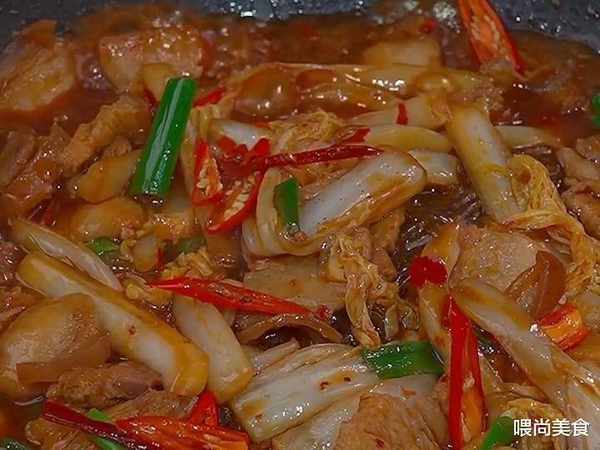 2、放入大白菜翻炒,把白菜炒軟瞭,再放入粉絲,加一碗熱水,再放入少許的鹽和雞精,燉至十分鐘,最後撒上蔥花和小米辣即可。