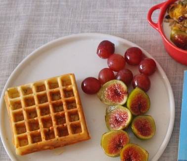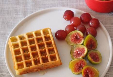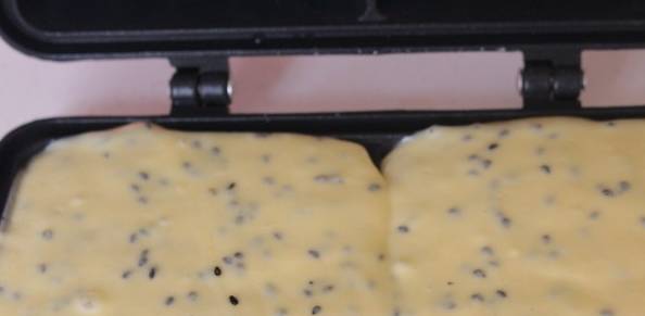 低筋面粉140克、玉米淀粉20克、泡打粉2克、細砂糖25克、牛奶90克、玉米油50克、雞蛋2個、芝麻5克、華夫餅模具1件