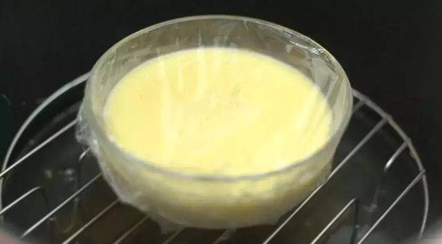 將混合好的牛奶雞蛋液倒入小碗中,用保鮮膜蓋好,防止水蒸氣進入雞蛋內,放入蒸鍋中,大火蒸10分鐘
