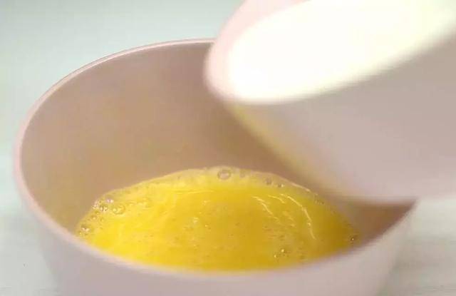 加入提前準備好的脫脂牛奶,與雞蛋液是一比一的配比,攪拌均勻