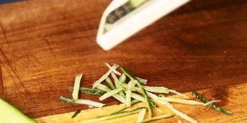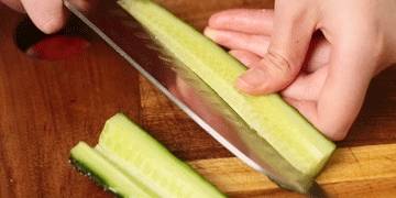 3.黃瓜切成絲,喜歡爽脆一點的口感,將黃瓜的瓤挖掉後再刨絲;