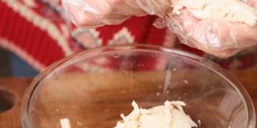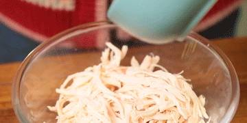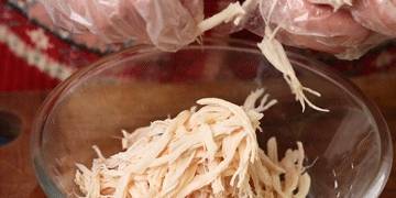 4.燜好的雞胸肉取出,放涼一會,順著纖維撕成粗條;