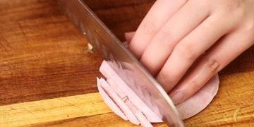 2.雞胸肉燜的同時準備其他配菜:海蜇絲再次切細一點,火腿片切成絲備用(不要太細哦,否則吃起來沒有存在感);