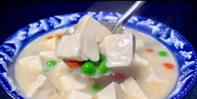 3、將魚湯過濾到砂鍋中,下入豆腐,一點豌豆,湯汁煮開後轉小火再燉上十分鐘。再加入些枸杞,適量的食鹽和胡椒粉翻拌一下,最後撒入蔥花,鯽魚豆腐湯就做好瞭。