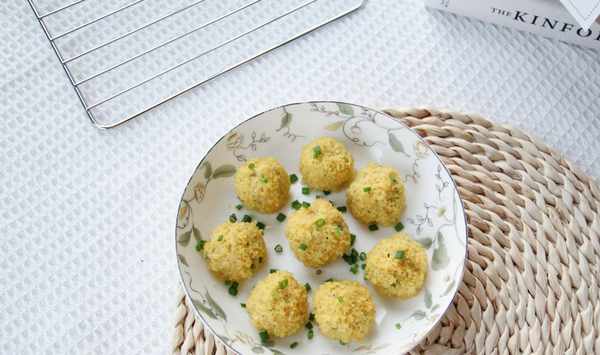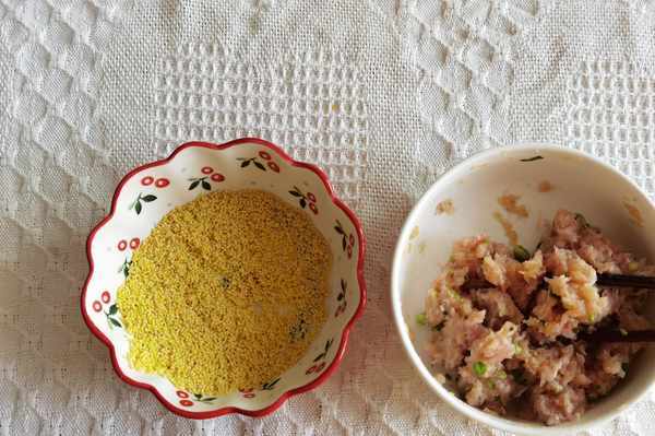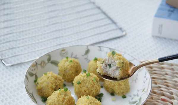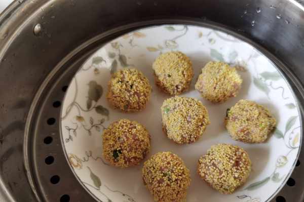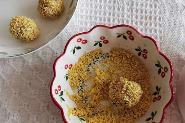 8、團成一個肉丸,滾上黃小米。