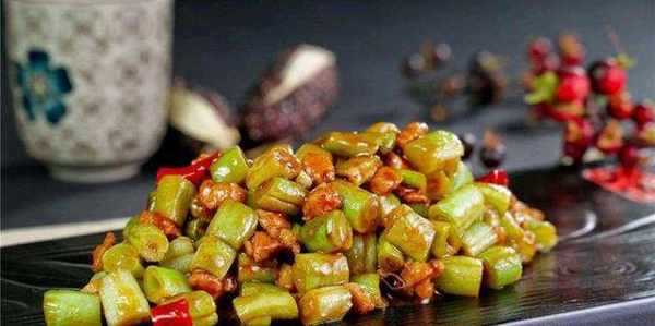 2鍋加油燒熱,下肉末炒變色,加幹辣椒、蔥末、蒜末炒香,放豇豆、紅椒炒勻,烹入醬油,加鹽、少許水、雞粉炒熟即可