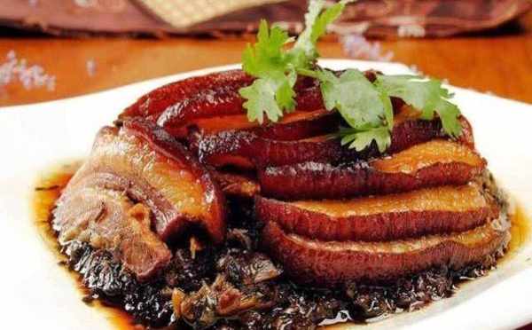 2,梅菜扣肉。材料:五花肉,梅菜,生抽,老抽,八角,料酒,雞粉,小蔥,香菜。做法:梅菜提前泡好,五花肉洗凈放入鍋裡煮至熟透,撈出洗幹凈,鍋燒熱不放油,將豬肉隻煎豬皮那一面,為瞭將豬皮去油並緊實,然後出鍋切片放入盤子,將泡好的梅菜幹洗凈,撈出擠幹水鋪在切好的五花肉上面,將八角放在梅菜上面。小碗倒入生抽、老抽、雞粉、料酒、糖一起攪拌均勻,將調好的汁倒入梅菜扣肉的盆中,用保鮮膜包好或者用碗蓋好,鍋中放水將梅菜扣肉放入,上汽蒸90分鐘即可出鍋。