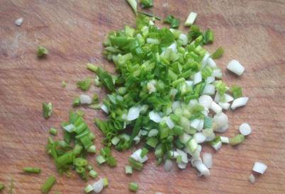 第三步:把蔥切成蔥花,蒜剝皮,切成碎末,放在盤子裡備用。