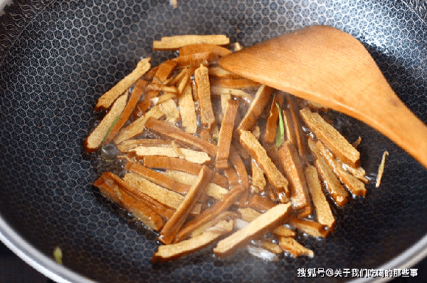 3、起鍋燒油,放入花椒炸香後撈出花椒扔掉,蔥薑放入花椒油中爆香,倒入豆幹小火煸炒一會兒,顏色焦黃後倒入芹菜、紅辣椒,大火翻炒一會兒,斷生後加入生抽、食鹽、雞精調味,翻炒均勻即可出鍋。
