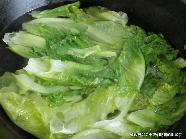 2、鍋裡倒入半鍋清水,大火燒開,放入半勺鹽、幾滴油,倒入生菜葉煮一會兒,變軟後立刻撈出,瀝幹水分後放入盤中。