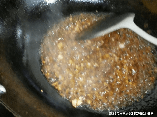 3、起鍋倒入適量油,翻入蒜末爆香,倒入碗裡的料汁攪拌均勻,小火煮一會兒,料汁變得濃稠後關火,澆在生菜上拌勻即可。