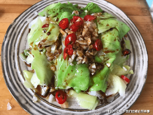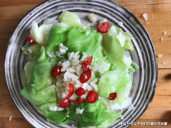 2、蒜瓣去皮切末,幹辣椒切段,小米椒切圈。起鍋燒水,水燒開後放入少量食鹽、食用油,倒入包菜葉煮半分鐘,撈出過涼水,瀝幹水分後放入盤中。