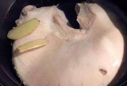 第三步,撈出來後,放入提前準備好的冷水中,過一遍冷水撈出,再次沖洗幹凈,一塊生薑洗凈後,切成片,重新給鍋中添上水,放入生薑片、花椒和八角,放入焯過水的豬肚;