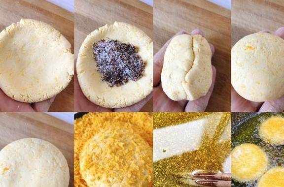 4、分好的面團用手揉搓成光滑的小面團,然後用手壓成厚度半厘米面餅,放入適量餡料捏緊面皮交和處,揉成圓再稍稍壓扁成厚度一厘米的面餅,然後放入面包糠中均勻的裹上面包糠。