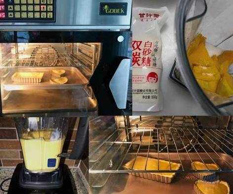 4、派皮放入預熱好的風爐150度烤10分鐘。烘烤的過程我們可以把南瓜和細砂糖以及雞蛋,淡奶油放入破壁機,高速攪打一分鐘。