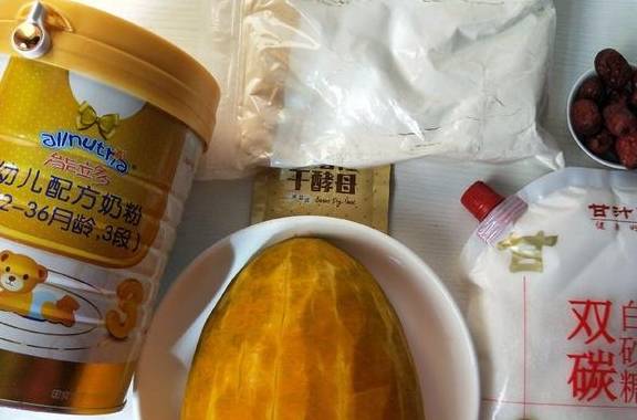 南瓜泥300克、面粉250克、雙碳白砂糖30克、牛奶90ml、酵母3克、紅棗幾顆