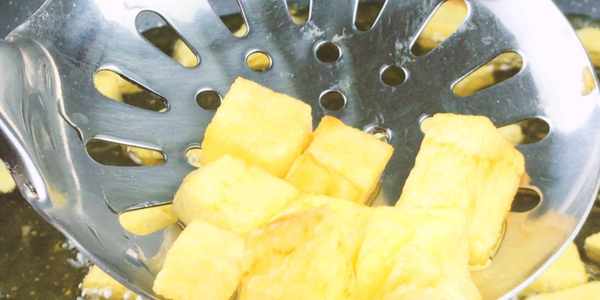 3.鍋燒熱放入食用油,下入土豆炸至微微金黃,即可撈出待用。
