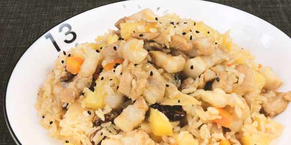6.電飯煲不用再加水用湯汁煮飯即可,按快速煮飯鍵時間到瞭可以聞到美味的飯香,好吃的土豆五花肉燜飯就做好瞭。