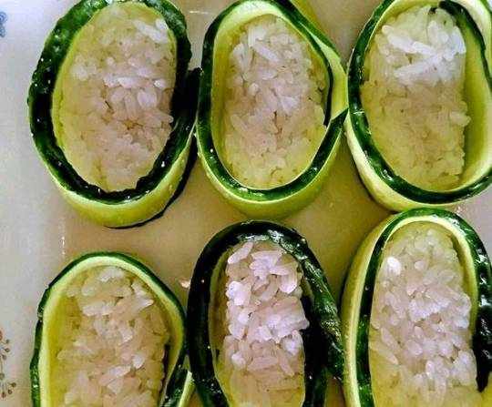 5.挖一勺米飯在手心,團成橢圓狀的飯團,然後用黃瓜片把飯團裹起來,再按壓一下,留出一點餘地就可以瞭