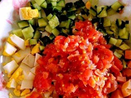 4.把火腿腸和剩餘的黃瓜切丁、煮熟的雞蛋,番茄也切成丁,再攪拌勻