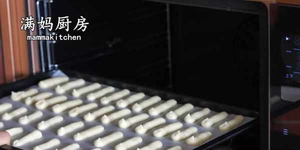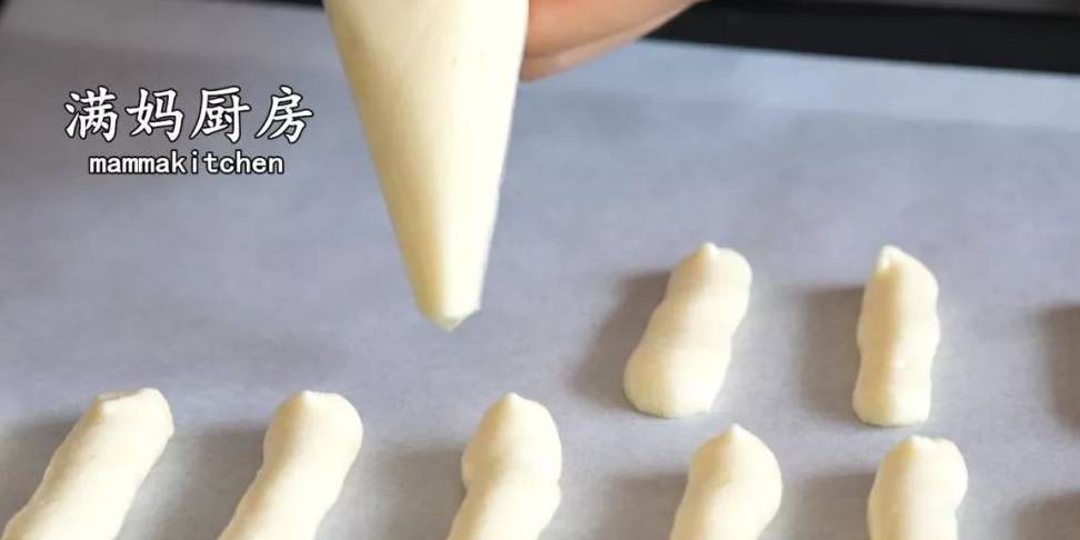8,把裱花袋剪一個小口,在烤盤上擠成小條狀(矽油紙建議墊一下,省得之後洗烤盤)