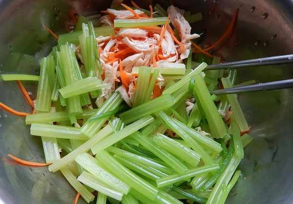 將芹菜洗凈切成細絲,放入開水中焯水 30 秒至 1 分鐘,撈出瀝幹備用。