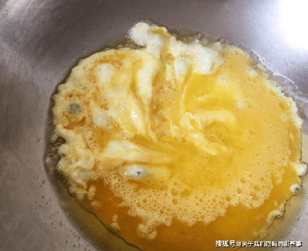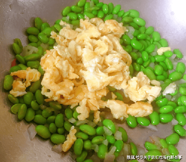 3、雞蛋快凝固時,倒入焯過水的毛豆,繼續煎一會兒,等到雞蛋完全凝固後,用鍋鏟炒成大塊,熟透後即可出鍋。