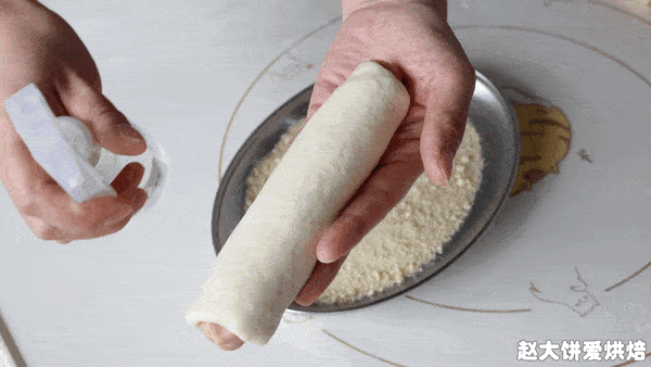 放一根烤腸,再卷起來,稍微搓長,包住烤腸(還可以在面團表面抹上芥末籽醬,或撒上一些黑胡椒粉,再卷香腸)