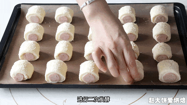 7,擺入烤盤,放入烤箱,進行二次發酵,溫度32度,發酵至1.5倍大
