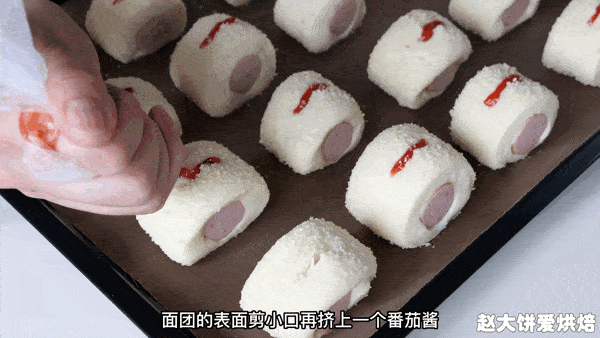 這次做瞭迷你的造型,面包軟乎乎的,腸仔肉汁滿滿,表面的芝士香脆,番茄醬透著亮光。特別是新鮮出爐的,更是誘惑,那個香啊,直勾魂。